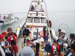 梅雨の真っ只中、第2回目の博多湾落し込み選手権が、博多沖防にて開催。当日は九州全域から落し込み釣りの頂点を狙う黒鯛師が、ぞくぞくとはやと丸の船着場へ集いました。大会数日前から降り続いた雨により、博多沖防にも相当の水潮が入り、各選手ともにポイント選定やエサ使いに頭を悩ませていました。競技スタートの合図から、干潮までのわずかな時間帯に小さな時合いがあり、それを逃さず集中的に攻め抜いた選手が釣果を上げ、上位に食い込む結果となりました。大会途中から降り始めた雨は、競技終了まで止むことなく選手を苦しめましたが、それに打ち勝つが如く、風雨に立ち向かい最後まで気迫の落し込みを続ける選手の姿に、九州黒鯛師の一尾に賭けるスピリッツを感じた大会となりました。 |