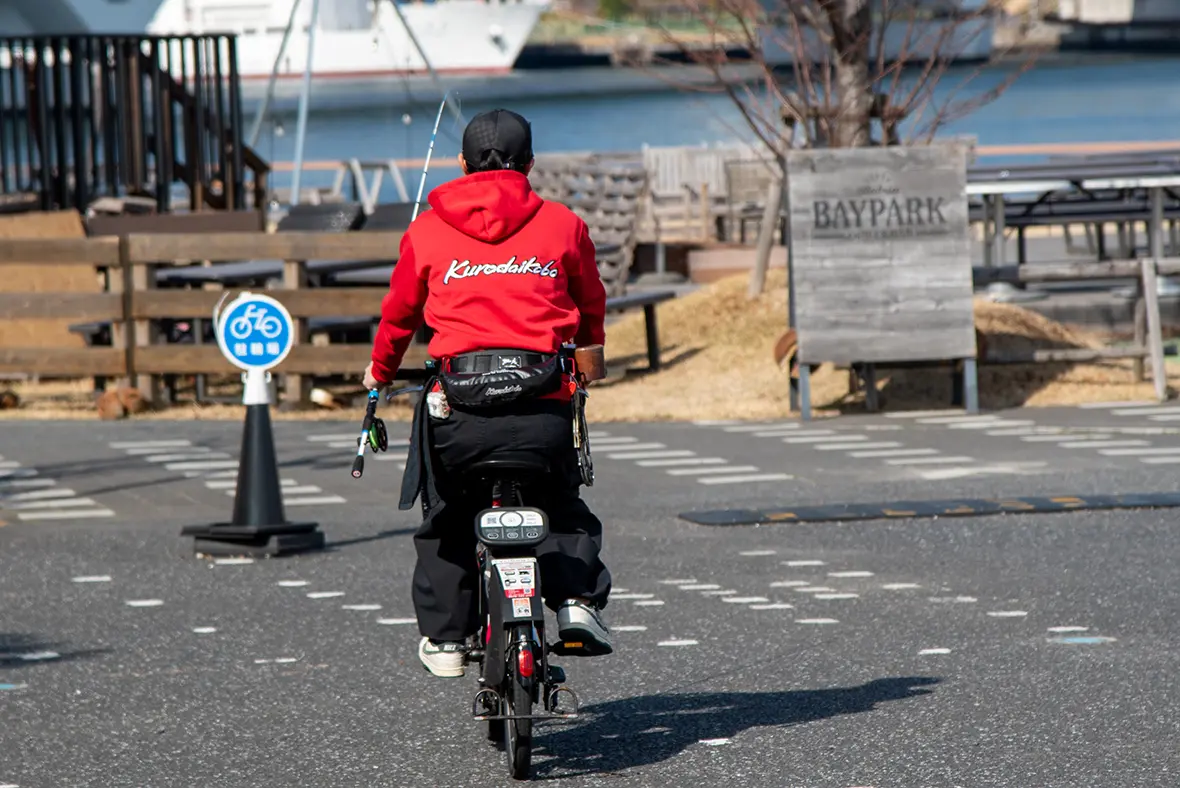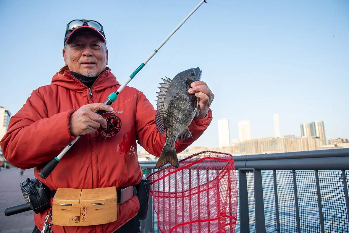 とは近藤吉将さん。もともと釣りは好きだった近藤さんはクロダイとやり取りする釣り人の姿に憧れて独学でヘチ釣りを始めた。すると、豊洲はぐるり公園のほかに自宅に近い運河内でもクロダイが釣れることが分かり、電動アシスト自転車のシェアリングサービスや公共交通機関を活用して行動範囲を広げ、潮見や夢の島、さらには中央区晴海や隅田川沿いにも足を延ばすように。