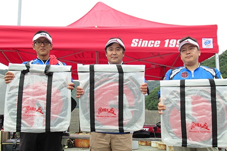 結果的に、厳しいコンディションでも46.5㎝の釣果を記録した『京阪チヌ釣り研究会Bチーム』が優勝。表彰式や、目玉賞品も登場したじゃんけん大会など、競技終了後も盛況にクラブ対抗イカダ釣り選手権は幕を閉じることができました。