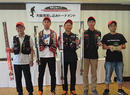 競技開始の合図とともに、竿を曲げる選手が多く見られましたが、予想していた大量釣果は望めない苦しい時間が続きました。上位12位までは複数枚の釣果を記録するなど、厳しい状況下でも超上層から地底まで丹念に釣り切れる選手に釣果がほほ笑んだものと思います。結果的に今大会の覇者は5枚の釣果を上げ、長寸審査で優位となった迎選手が栄光を勝ち取りました。