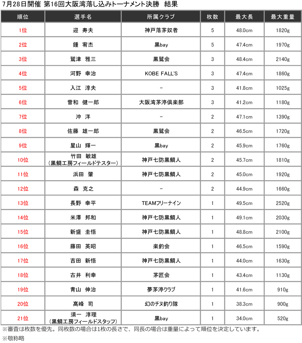 第16回大阪湾落し込みトーナメント決勝大会が7月28日(土)、昨年覇者(シード権)の竹田敏雄選手と、各予選を勝ち抜いたファイナリスト33名の合計34名が、大阪湾黒鯛師の頂点を決するべく釣戦しました。