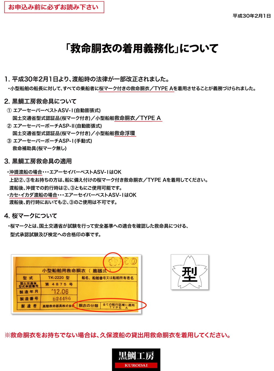 平成30年2月1日より渡船時の法律が一部改正され、渡船船長に対して、すべての乗船者に桜マークつきの救命胴衣(TYPE A)を着用させることが義務付けられました。ウエストポーチ式救命浮環は渡船時にはご使用できません。