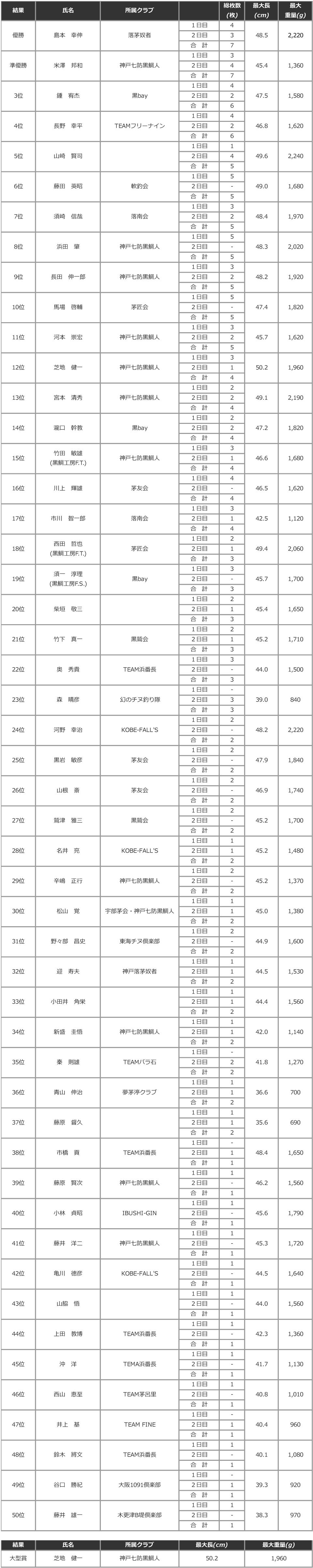 結果的には1日目は総枚数で100枚を超える釣果が記録され、複数の釣果成績を残した選手も多い為、2日目の競技は熾烈なトップ争いになる展開となりました。