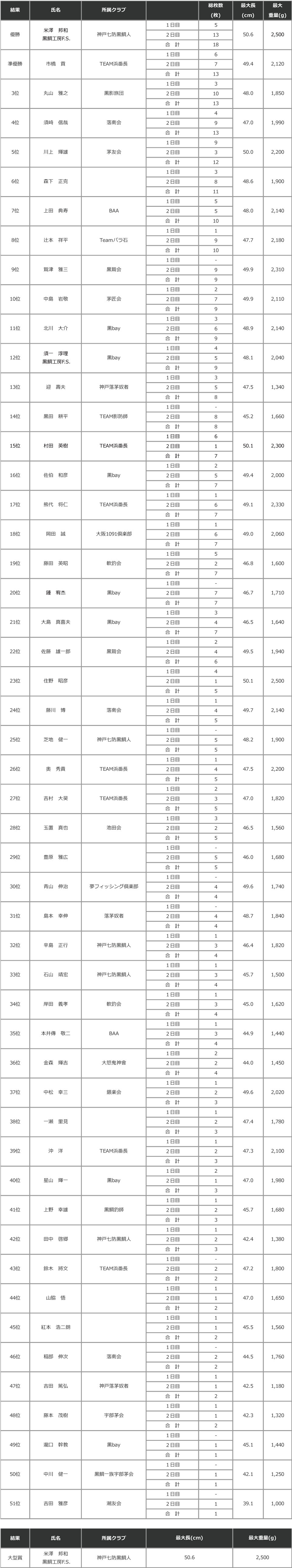 今大会は過去に例のない釣果でもあり、2日間を通しての総枚数は303枚、全選手に釣果があったのも過去18回で初めての記録となりました。