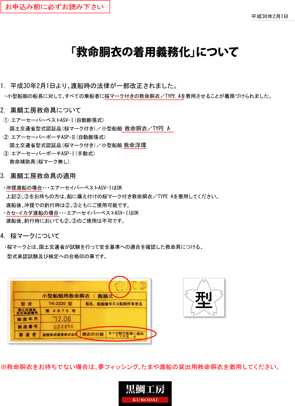 平成30年2月1日より渡船時の法律が一部改正され、渡船船長に対して、すべての乗船者に桜マークつきの救命胴衣(TYPE A)を着用させることが義務付けられました。ウエストポーチ式救命浮環は渡船時にはご使用できません。