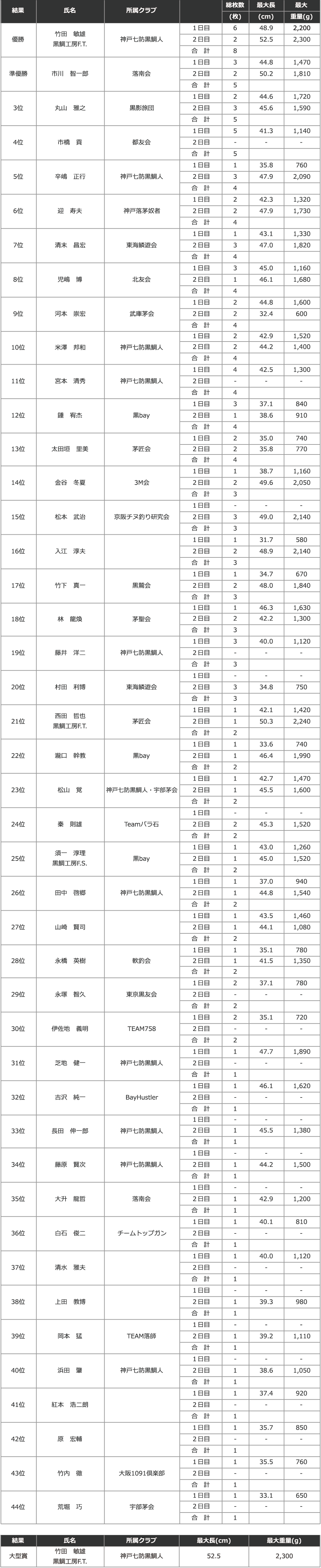優勝: 竹田 敏雄 クラブ名:神戸七防黒鯛人