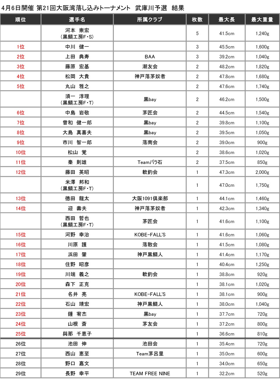 1枚のみの選手では、長寸勝負で惜しくも予選敗退の選手も・・・。春の予選大会では1枚を釣ることの重要性を改めて痛感することとなりました。