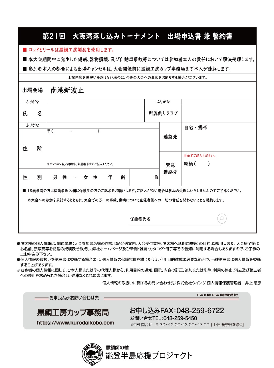 ※黒鯛工房カップ大会運営においての個人情報の取扱いに関するお問合せ先:株式会社ウイング黒鯛工房事業部 個人情報保護責任者 井上 昭彦