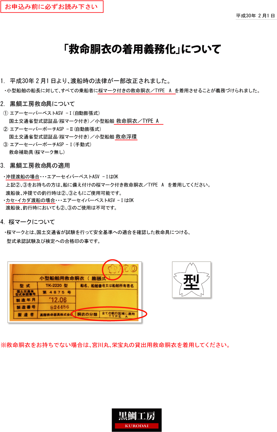 平成30年2月1日より渡船時の法律が一部改正され、渡船船長に対して、すべての乗船者に桜マークつきの救命胴衣(TYPE A)を着用させることが義務付けられました。ウエストポーチ式救命浮環は渡船時にはご使用できません。