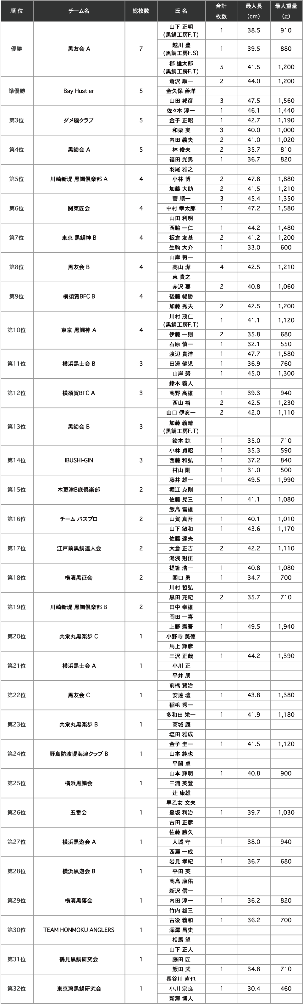 ※審査は釣り上げたチームの総枚数で順位を決定しています。同枚数の場合はチームでの最大長で審査します。