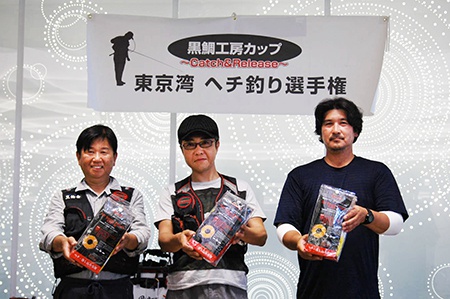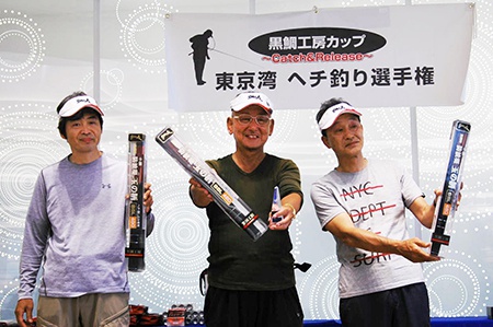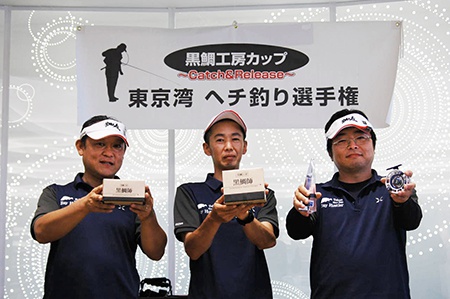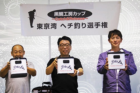 また、表彰式会場にて入賞クラブのメンバーを含め、毎年白熱するじゃんけん大会で商品を手にされた選手の皆様からも黒鯛稚魚放流への募金協力をいただきました。集まった放流資金(47,633円)は東京湾黒鯛研究会の佐藤会長へ全額お渡しし、今年の稚魚放流事業に充てていただくことをお願いいたしました。