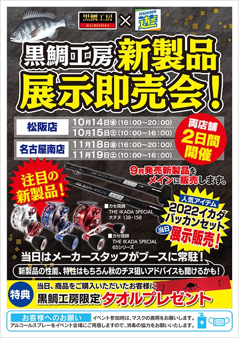 黒鯛工房公認グローバルショップでもあるフィッシング遊名古屋南店で、今週末に秋の新商品展示受注会を開催します。新商品を実際に手に触れてご予約、ご購入いただけるイベントとなっています。お近くの方は是非お越しください!!