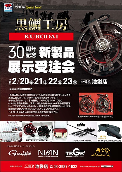 黒鯛工房創業30周年記念の限定生産へチリールの展示受注会を2026年2月20日(金)~23日(祝)まで、上州屋池袋店にて開催されます。 関東の黒鯛工房ファンの皆様、弊社グローバルショップの上州屋池袋店まで是非お越しください!!