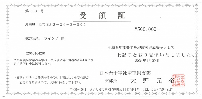 2023年に開催いたしました「第19回 大阪湾落し込みトーナメント」、「第1回 ロクマルチャレンジ!イカダ釣り選手権」、「第15回 東京湾クラブ対抗ヘチ釣り選手権」、「第17回 クラブ対抗イカダ釣り選手権」にてご協力いただいた義援金298,000円、「釣りフェス2024in Yokohama」の物販にてご協力いただいた義援金141,000円、黒鯛工房より61,000円の合計500,000円を、『日本赤十字社 令和6年能登半島地震災害義援金』として送金致しました。